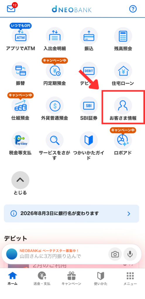 お客様情報をタップ