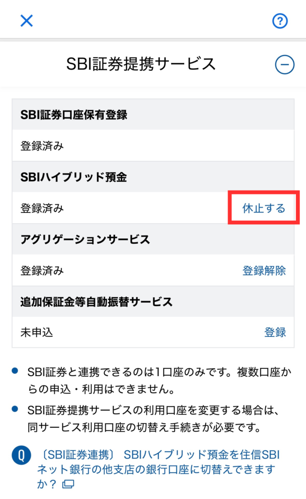 ページを下にスクロールして、SBI証券提携サービス内のSBIハイブリッド預金の「休止する」をタップ