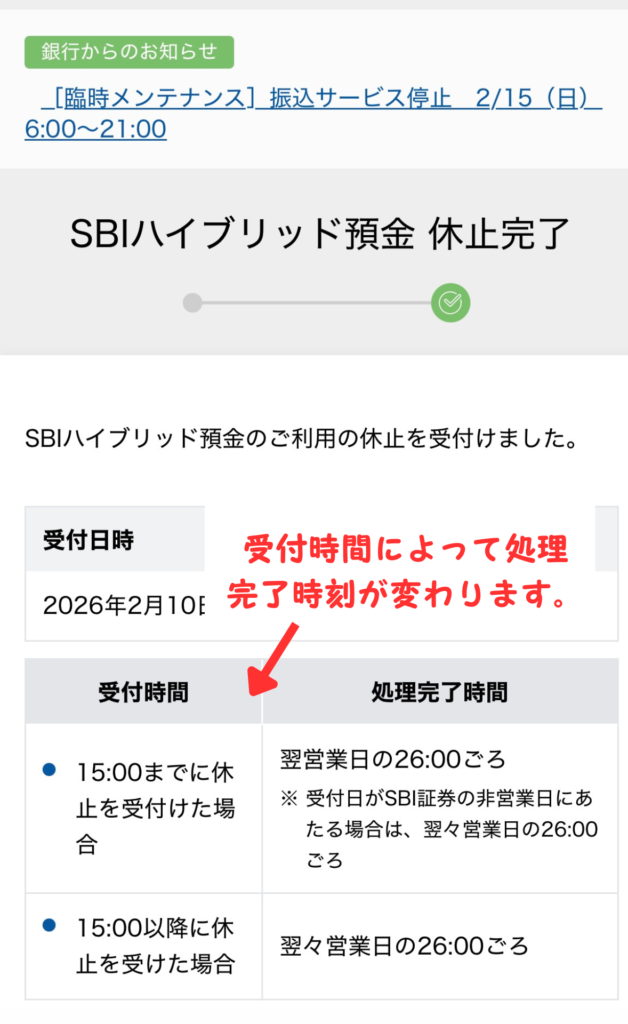 休止手続きの受付が15:00までの場合:翌営業日の26:00ごろ